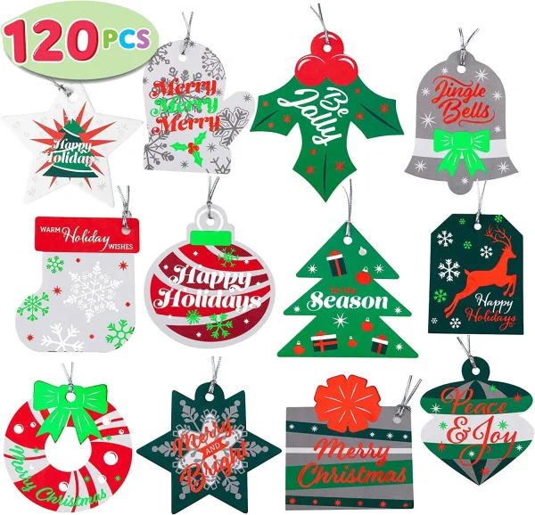 - OurโFoil Christmas Gift Tags with Strings includes 120 pieces of 12 different designs. Each hang tags has a foil effect in the front and โTo and fromโ at the back for personalization. Metallic tinsel silver rope is already attached to each tag & ready to use!