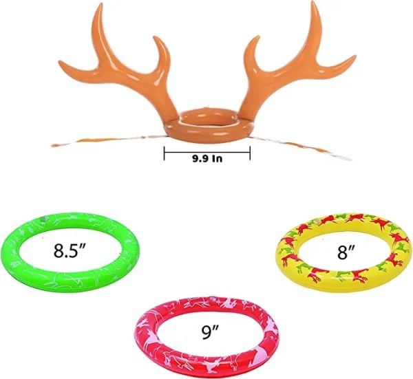 - Reindeer Antler Hats are measured 9.9″. Rings come in 3 different size 9″,8.5″ and 8″ (inflated size), Pin the Nose game measures 20.5″ for the game sheet with 3″ – 3.5″ for the stickers