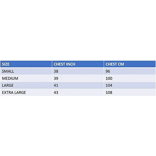 β’ Small Chest Size: 38β³, Medium Chest Size: 39*, Large Chest Size: 41β³, Extra Large Chest Size: 43β³
