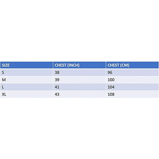 • Small Chest Size: 38″, Medium Chest Size: 39*, Large Chest Size: 41″, Extra Large Chest Size: 43″